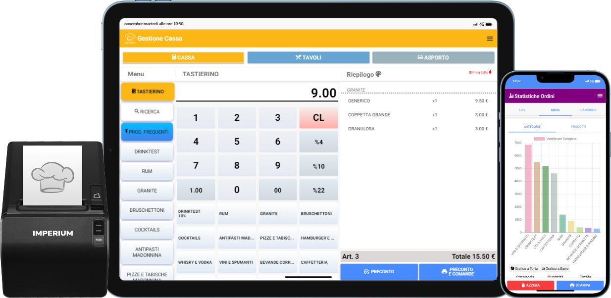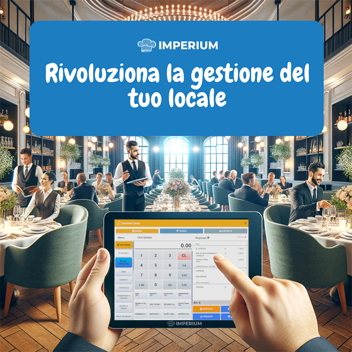 Il Gestionale del Tuo Ristorante Imperium Rivoluzionerà il modo in cui potrai lavorare in piena libertà. La piena libertà ha significato che puoi utilizzare qualsiasi tipo di dispositivo per far funzionare il Gestionale per Ristorante Imperium: Android, Windows , Apple. Il gestionale Imperium permette anche si installare Palmari per le ordinazioni Android o Apple, come Stampanti Fiscali: Epson, Custom, Edit, Ditron, RCH, DTR, Axon. E' compatibile con Protocollo 17 Scambio Importo per i Pagamenti tramite POS Bancario con emissione dello scontrino del Terminale POS direttamente dalla Stampante Fiscale, come da ultima normativa di Legge e già pronto per l'obbligo di invio di…